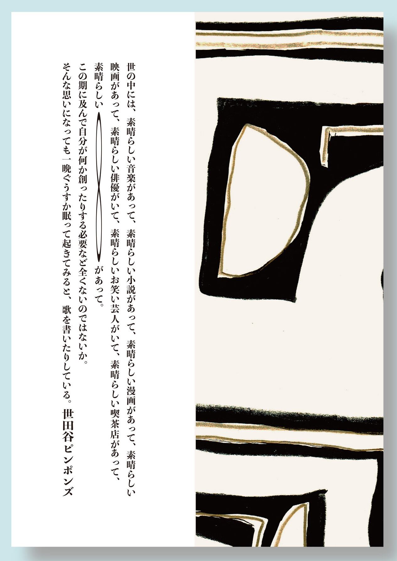 正式タイトル→『世の中には、素晴らしい音楽があって、素晴らしい小説があって、素晴らしい漫画があって、素晴らしい映画があって、素晴らしい俳優がいて、素晴らしいお笑い芸人がいて、素晴らしい喫茶店があって、素晴らしい∞∞∞ ∞∞∞ ∞∞∞ ∞∞∞ ∞∞∞があって。